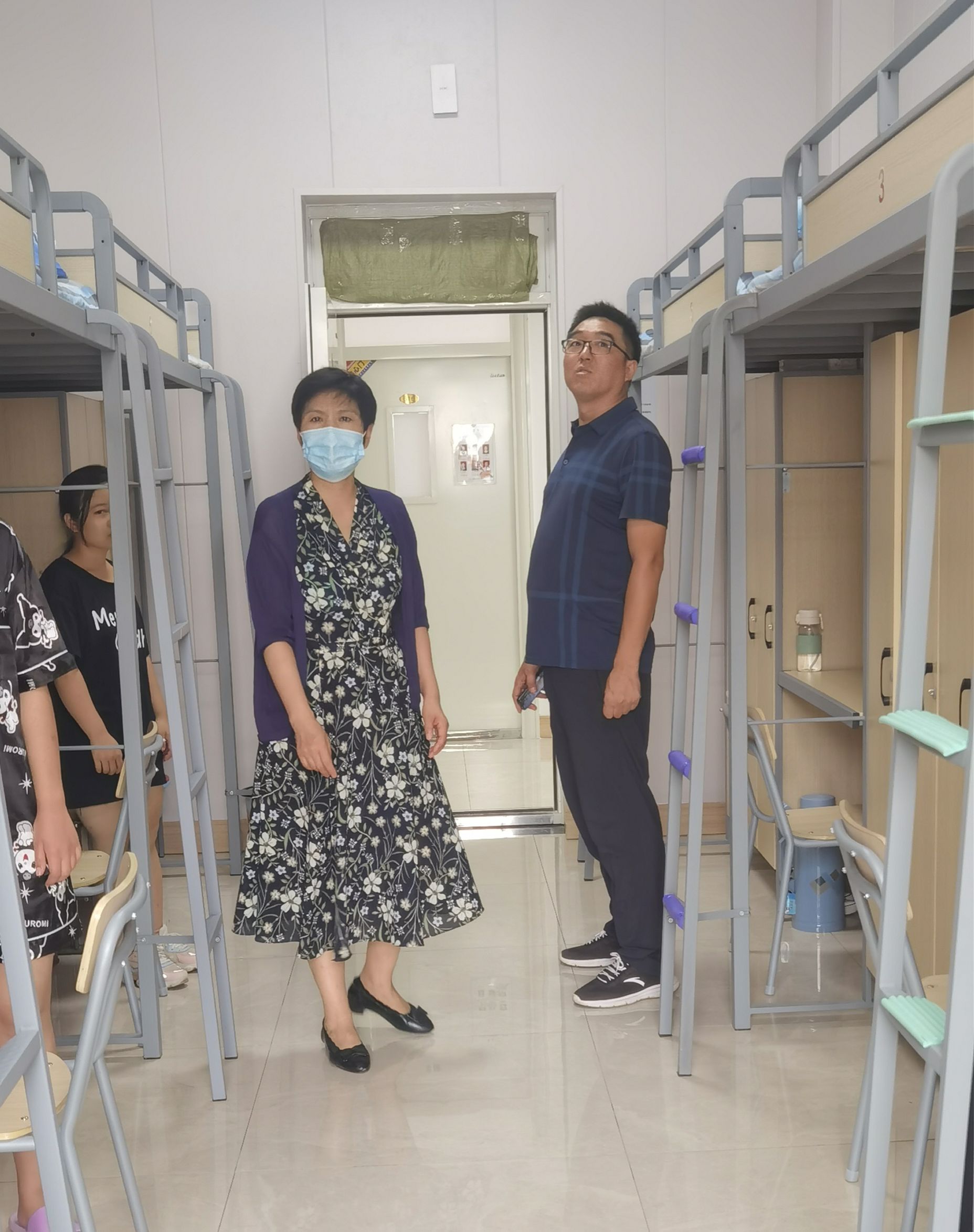 2022年8月18日上午,外国语学院党委第一负责人张梅英、党委第二负责人陈杨波及2021级辅导员对2021级军训学生宿舍访察并看望了同学们。