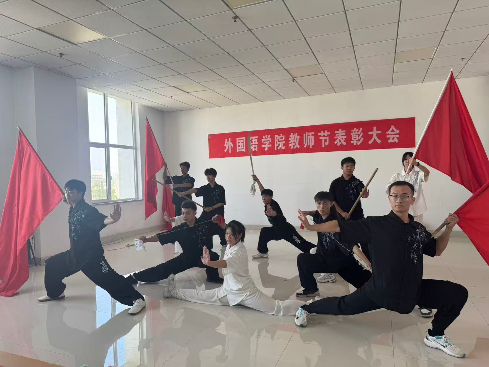 庆祝活动节目精彩纷呈,尽显外国语学院师生风采。应用英语系、法语教研室、日语教研室全体教师带来多语诗歌朗诵《致敬,老师》,英、日、法等多语种交替呈现,字里行间满含对教育事业的热爱与坚守;学生们以活力舞蹈“Jump”点燃现场气氛,用灵动舞姿展现青春朝气;公共英语教研室(二)全体教师合唱英语歌曲《Five Hundred Miles》,悠扬旋律传递出师生间的温情与共鸣;学生代表朗诵《杏花春雨,师爱不已》,用细腻文字描绘教师的无私奉献;公共英语教研室(一)全体教师带来诗朗诵《讲台边的摆渡人》,诠释教师“以爱为舟,载梦远航”的使命担当;王晓红老师演唱歌曲《如愿》,温柔歌声传递对教育理想的追求;12名武术协会学生演绎了武术《武韵惊鸿》,刚劲如松的拳术与行云流水的剑法交错呈现,一招一式间既有少年的昂扬锐气,又不失东方武学的雅致韵味,刚柔并济的动作彰显出学子们文武兼修的多面素养。