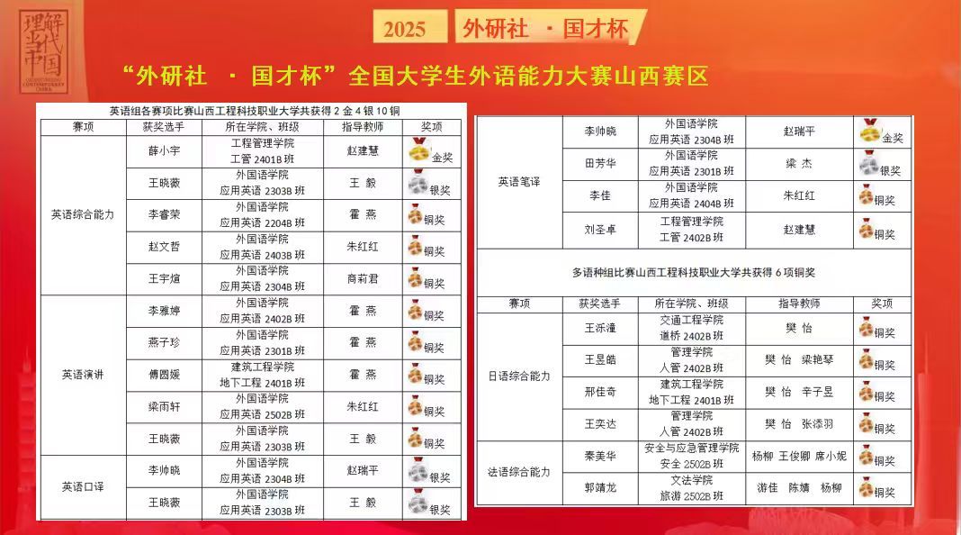 2025年11月1日,由山西省教育厅指导、山西省高等院校外语教学研究会和外语教学与研究出版社联合主办、山西大学外国语学院承办的2025“外研社•国才杯”“理解当代中国”英语组综合能力、演讲、笔译、口译赛项和多语种组比赛山西赛区复赛圆满落幕。在与省内31所本科院校的激烈竞争中,我校22位选手参赛,共获得英语组省级金奖2项、银奖4项、铜奖10项和多语种组铜奖6项。