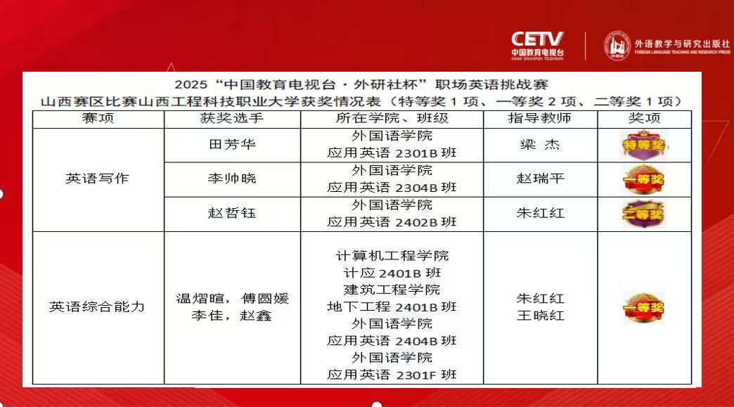 2025年11月2日,山西省职业教育外语教学指导委员会和外语教学与研究出版社联合主办、山西财政税务专科学校承办的2025“中国教育电视台·外研社杯”职场英语挑战赛山西赛区英语综合能力和英语写作比赛顺利举行,我校综合能力参赛团队获得省级一等奖、三名写作选手分别获得特等奖(晋级国赛)、一等奖和二等奖。